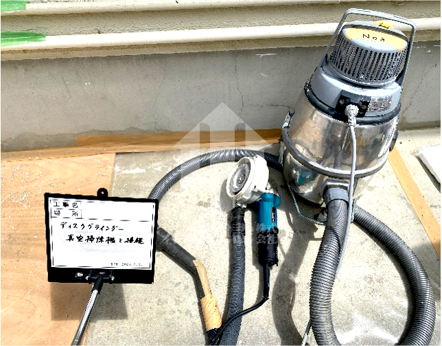 ディスクグラインダーにHEPAフィルター付き真空掃除機を接続し、塗材を削りながら粉じんを吸引していきます。
